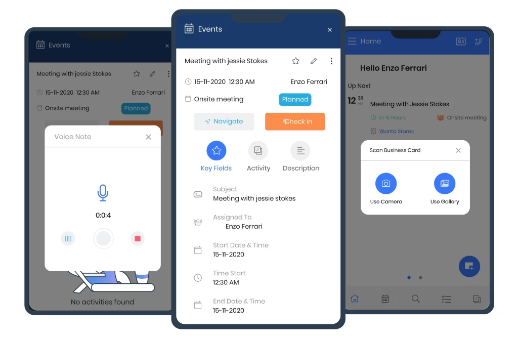 Mit unseren mobilen Apps für Android und iOS können Sie von überall aus arbeiten. Finden Sie problemlos Ihren Weg zu Meetings, indem Sie alle erforderlichen Informationen und Navigationsdetails direkt in der App abrufen. Nutzen Sie das Mikrofon für Sprachnotizen, Anrufaufzeichnungen und kurze Notizen zur späteren Überprüfung. Zudem können Sie Visitenkarten im Handumdrehen scannen und so wertvolle Zeit sparen, indem Sie Informationen direkt erfassen.